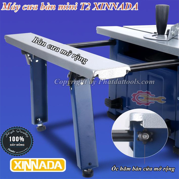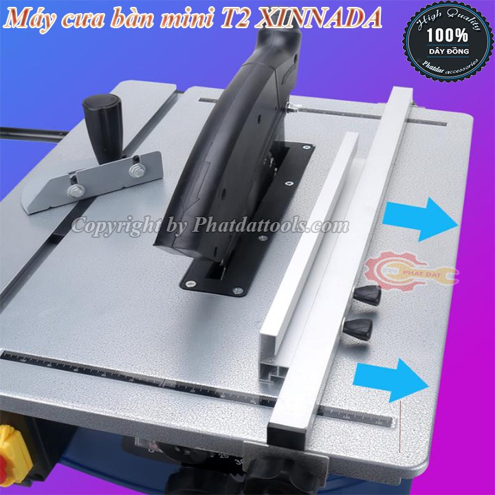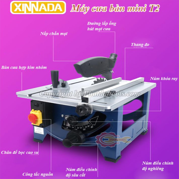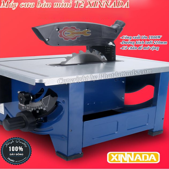 Máy cưa bàn mini XINNADA T2 là dòng máy cưa bàn cỡ nhỏ,chuyên dụng để cắt xẻ gỗ,kim loại trong các xưởng vừa và nhỏ,trong gia đình,chế tạo đồ gỗ mỹ nghệ,trang trí nhà cửa ,gỗ đóng thùng hàng,DIY...Máy cưa bàn mini XINNADA T2 có thiết kế hiện đại với mặt bàn và hệ thống cữ,ray trượt bằng nhôm đúc,khung sườn bằng thép cho độ cứng cáp,chịu mài mòn cao.