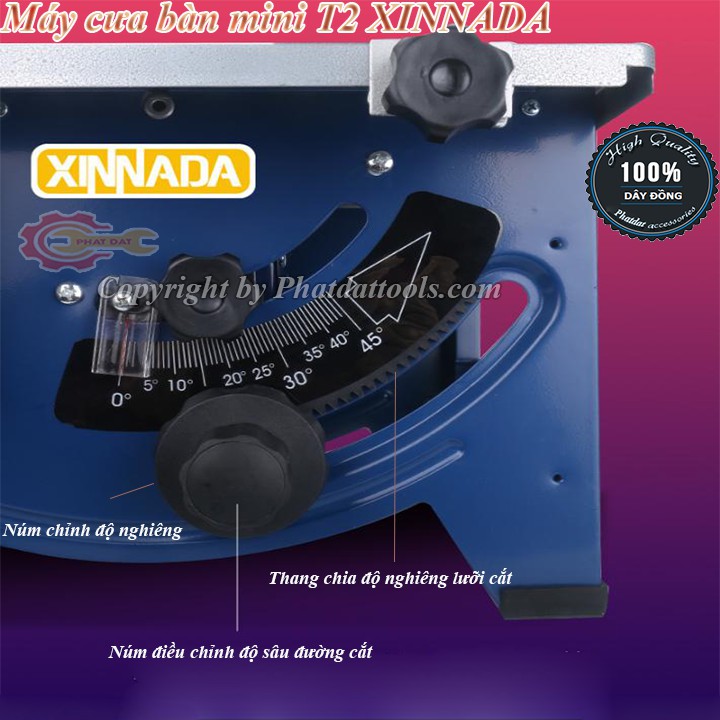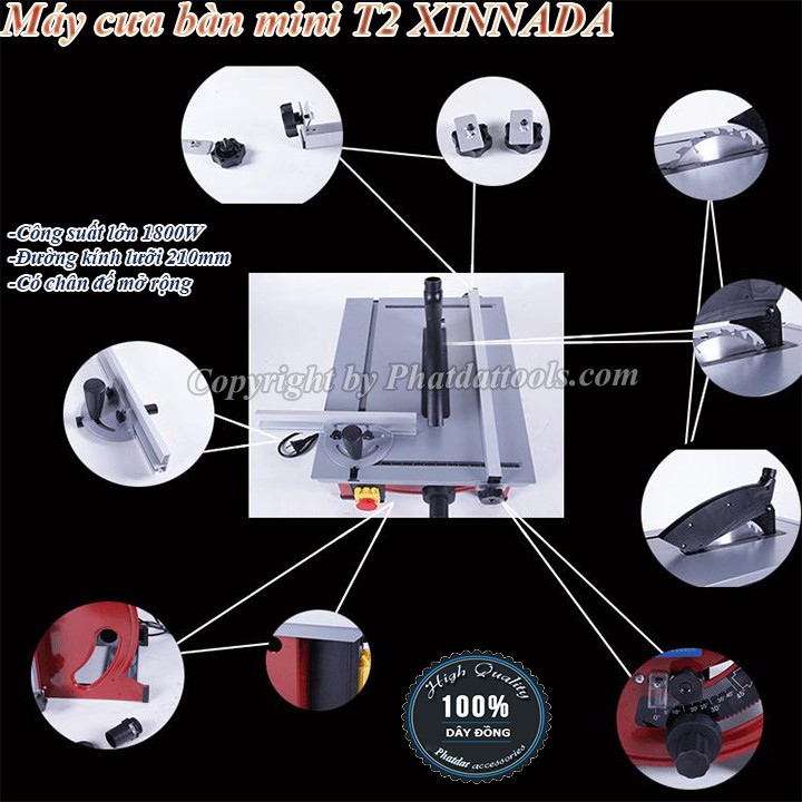 Máy cưa bàn mini XINNADA T2 có công suất lớn 1800W lõi đồng 100% cho tuổi thọ cao,hệ thống thang đo chính xác,có hệ thống bàn mở rộng ra giúp bạn có thể gia công được các tấm gỗ khổ lớn.Có hệ thống lắp ống hút bụi ở phần lưỡi trên và phía dưới động cơ.