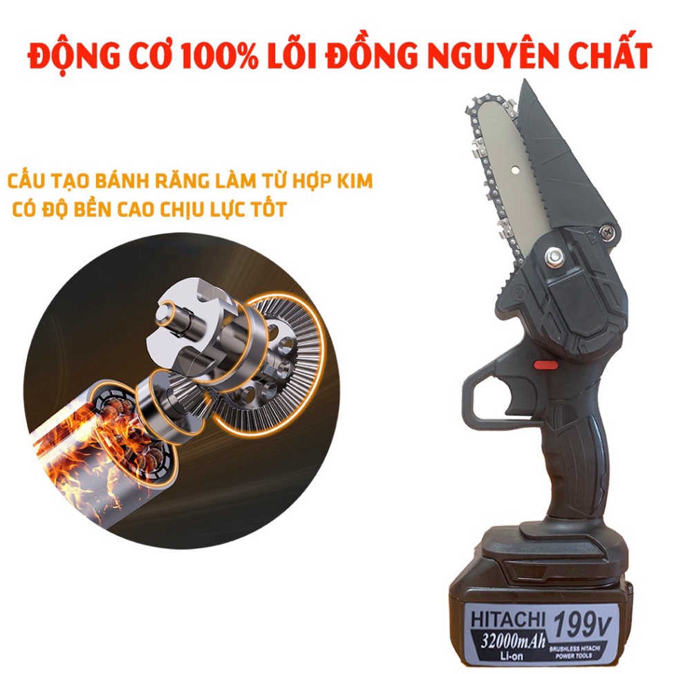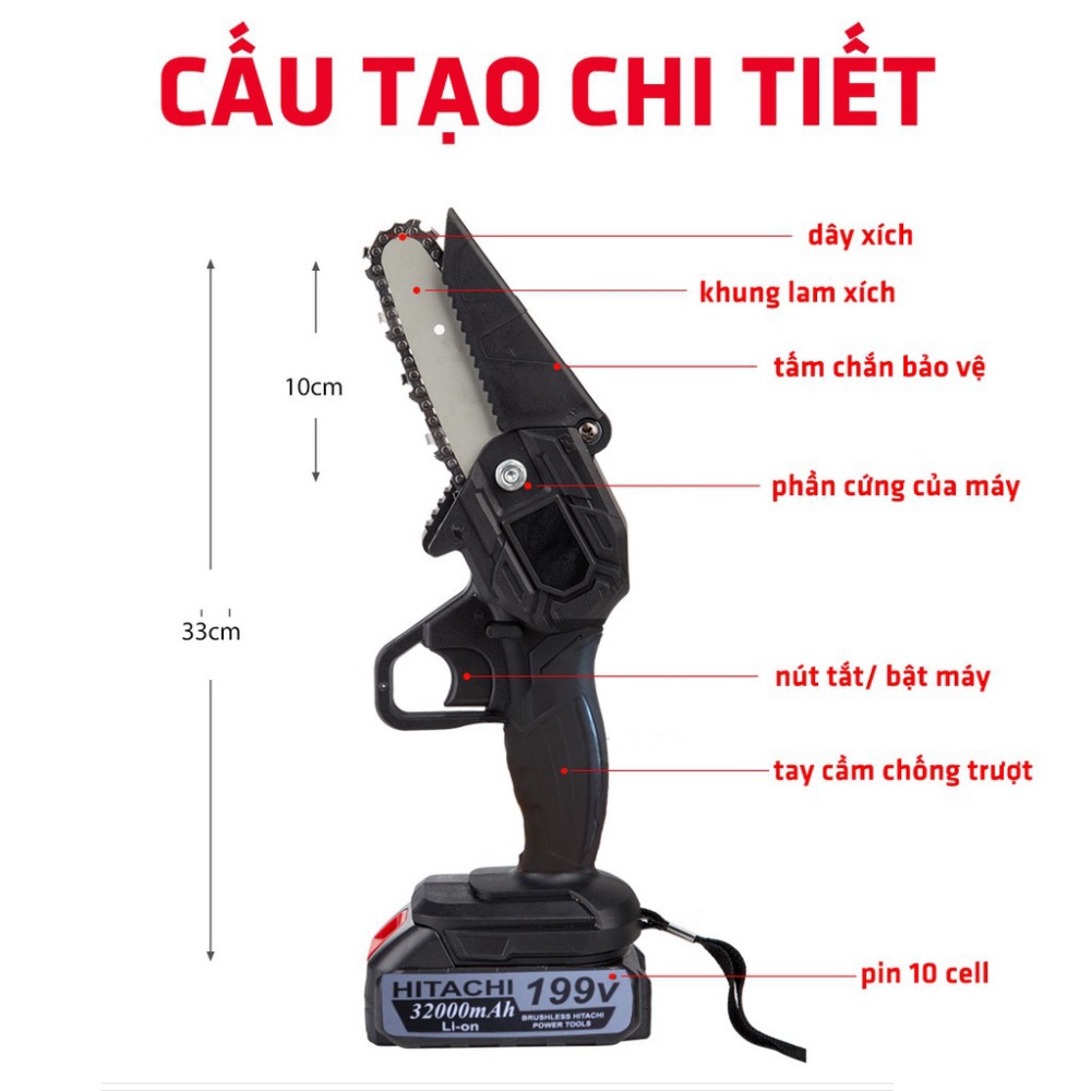 MÁY CƯA XÍCH DÙNG PIN HITACHI 199V - CHUẨN LÕI ĐỒNG 100% - PIN CHUẨN 10 CELL:💡 Công việc cắt tỉa các cành nhánh kích thước to hay cắt cành nhánh số lượng cây lớn với các công cụ kéo cắt cành cưa cắt cành thông thường trở nên mệt mỏi hiệu xuất thấp.Cưa xích cầm tay mini chạy pin là thế hệ công cụ làm vườn mới được sinh ra để giảm sức lao động tăng năng xuất hiệu quả làm vườn.