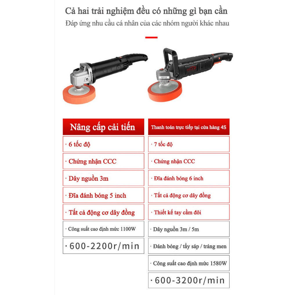 - Bộ bao gồm : Máy đánh bóng + tay cầm thẳng + tay cầm cong + đĩa đánh bóng + chổi than