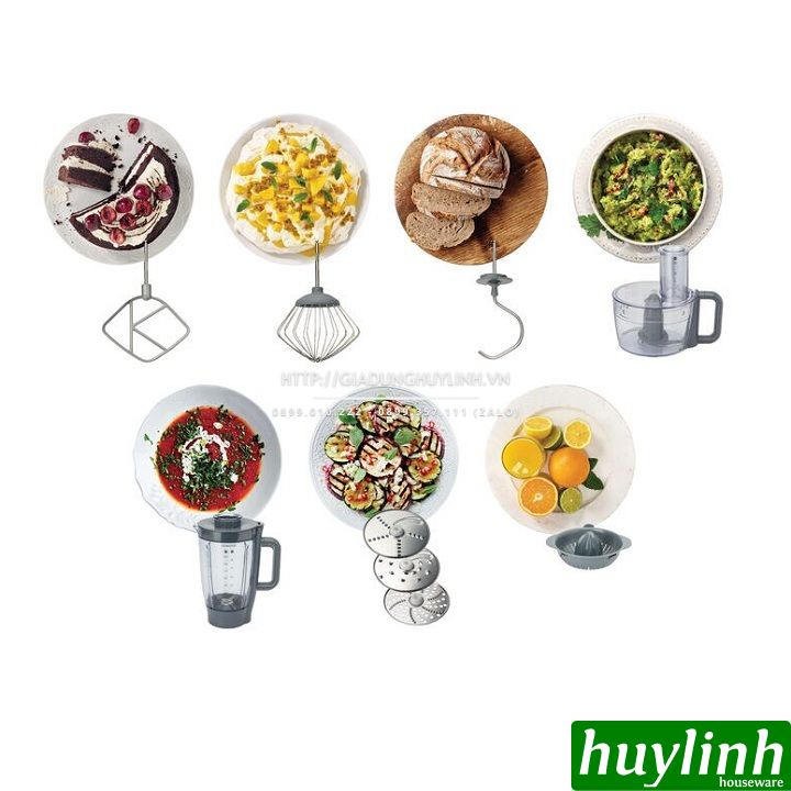 - Đi kèm với máy trộn bột sẽ có cối xay sinh tố (nhựa) 1.5 lít, cối cắt xay đa năng, phụ kiện vắt cam và 3 móc trộn bột, đáp ứng nhu cầu chế biến, sử dụng khác nhau: