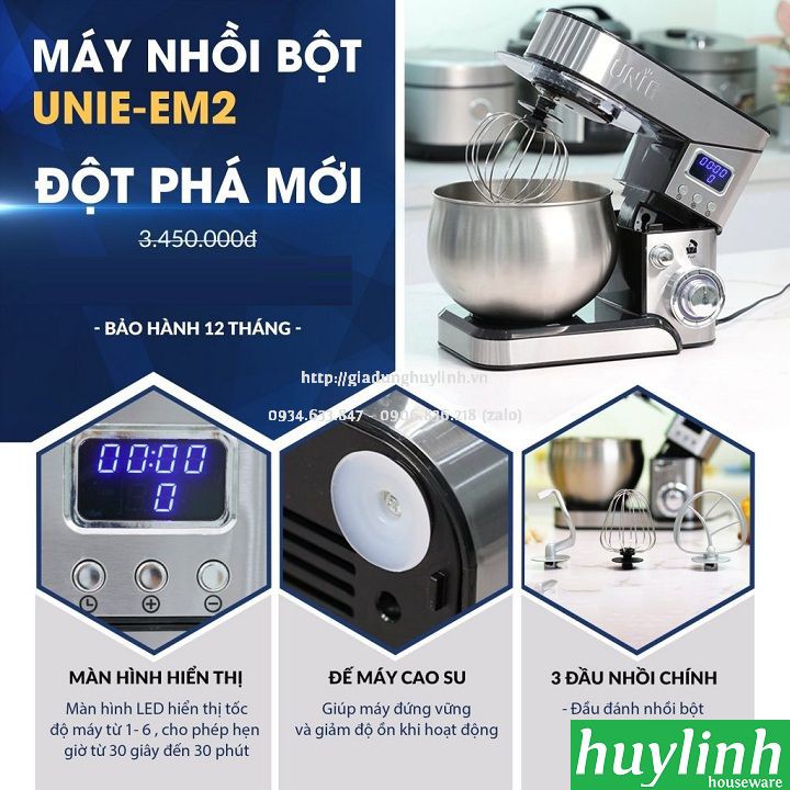 Máy trộn bột Unie EM2 với công suất hoạt đồng tới 1000W, dung tích thố trộn 5 lít với khả năng trộn tối đa tới 600 gram bột trên 1 lần đánh.Huy Linh phân phối và bảo hành chính hãng tại Unie Việt Nam