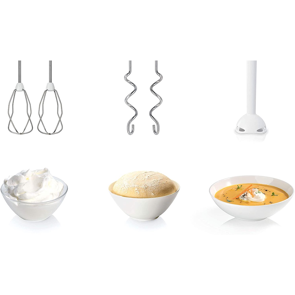 - Khuấy, nhào và trộn rất dễ dàng! Nhờ trọng lượng thấp và tay cầm có hình dạng công thái học, máy trộn nằm thoải mái trong tay.