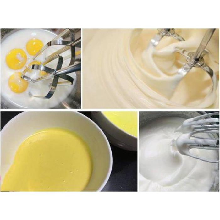 Máy trang bị 4 que , 2 que trộn và 2 que mốc nhào (bột lỏng) làm bằng inox không gỉ cao cấp, đảm bảo chất lượng, vệ sinh cho hỗn hợp trứng, kem, bột. Bộ dụng cụ hữu hiệu dùng cho các chức năng đánh trứng, và các loại thực phẩm khác