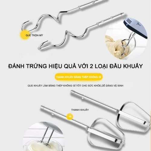 Đây là chiếc máy đánh trứng tuyệt vời cho các mẹ. Là dạng máy cầm tay, nên các mẹ có thể đánh trứng ở bất kỳ đâu: trong chén to, trong ly/cốc, trong nồi... đều được. Máy đi kèm với 2 thanh đánh trứng 4 cạnh, và 2 que xoắn để nhào bột hoặc trộn salad. Que trộn làm từ inox, có thể tháo rời được, dùng xong chỉ cần tháo ra vệ sinh que trộn là xong.