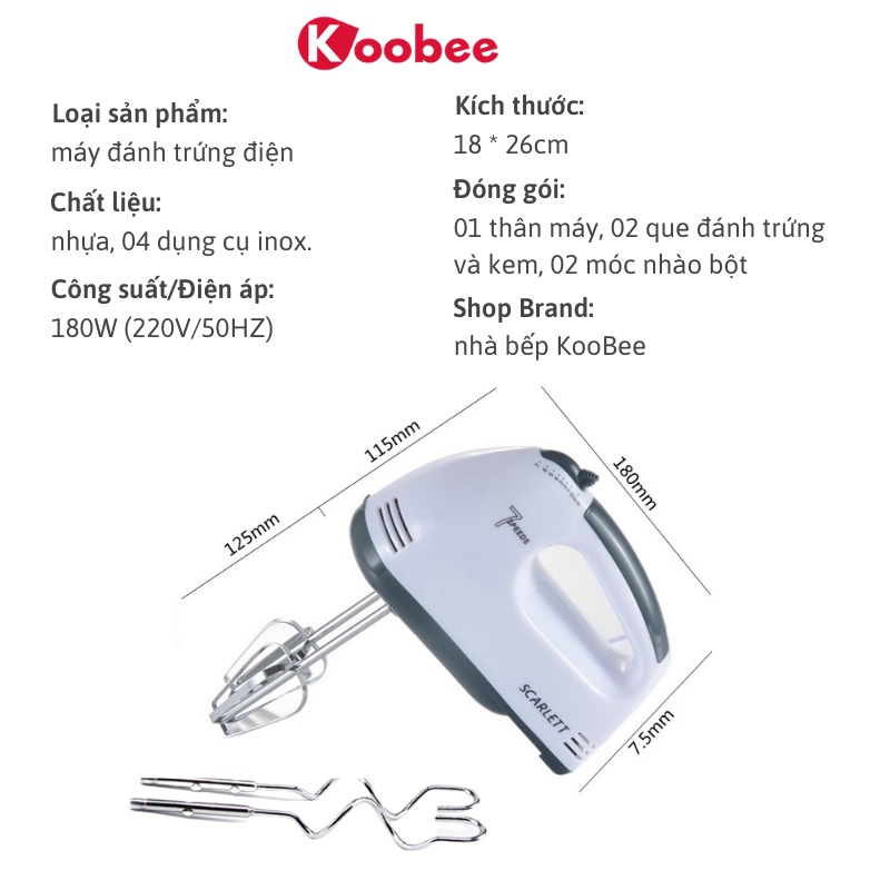 - Quy cách đóng gói: 01 thân máy, 02 que đánh trứng và kem, 02 móc nhào bột