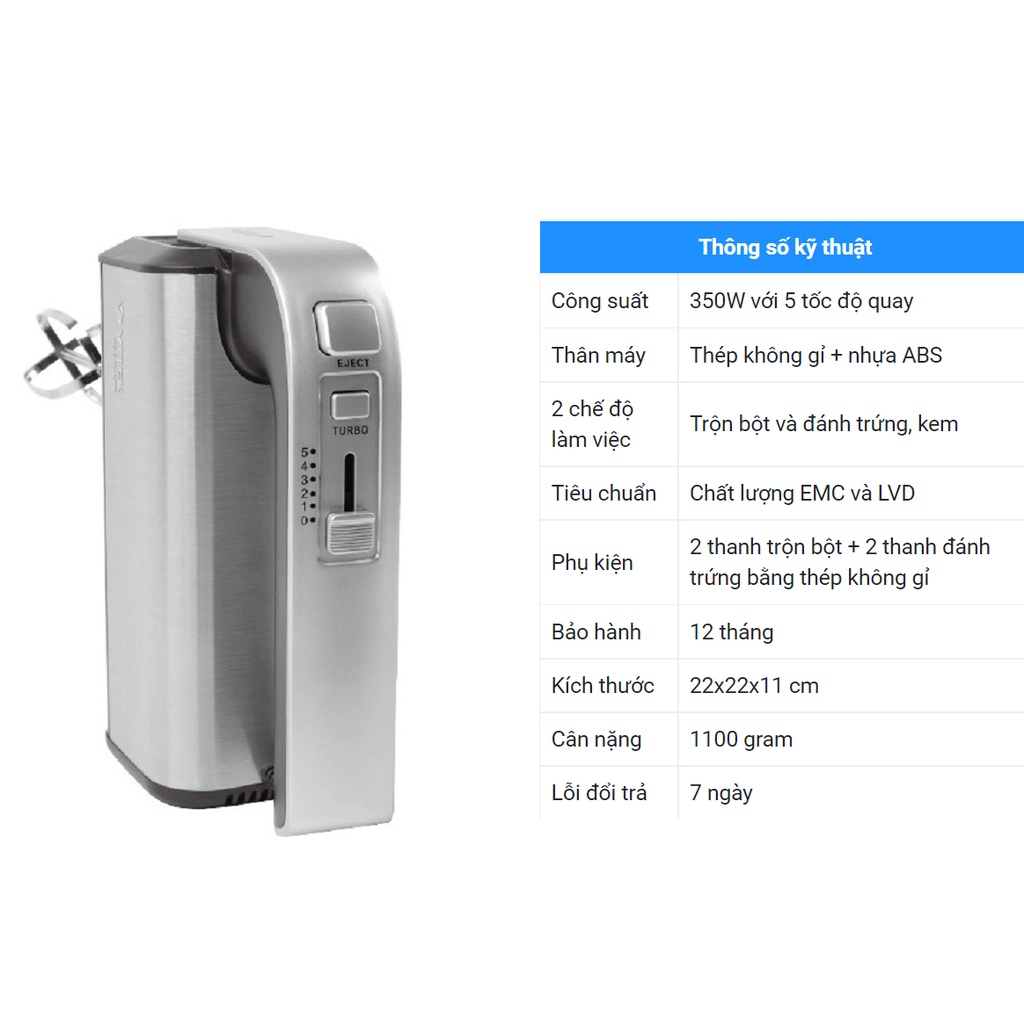 - Phụ kiện: 2 thanh trộn bột + 2 thanh đánh trứng bằng thép không gỉ
