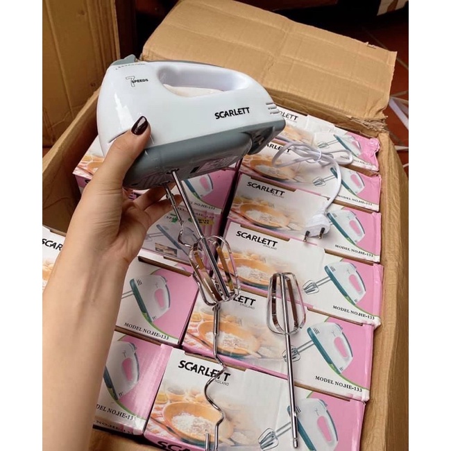 MÁY ĐÁNH TRỨNG CCAAMF TAY SCARLETT CÔNG SUẤT 18OWMáy đánh trứng chính là một trợ thủ đắc lực nếu bạn thường xuyên làm bánh. Một chiếc máy đánh trứng không chỉ giúp bạn hoàn thành những công việc đánh kem, trộn bột, đánh bông trứng… một cách nhanh gọn và sạch sẽ nhất mà còn vô cùng hữu dụng để trộn salat, làm kem hoặc nước sốt. Hôm nay mình sẽ giới thiệu đến mọi người một trong những chiếc máy đánh trứng cầm tay rẻ nhất nhé! Đó chính là Máy đánh trứng cầm tay Scarlett 180W