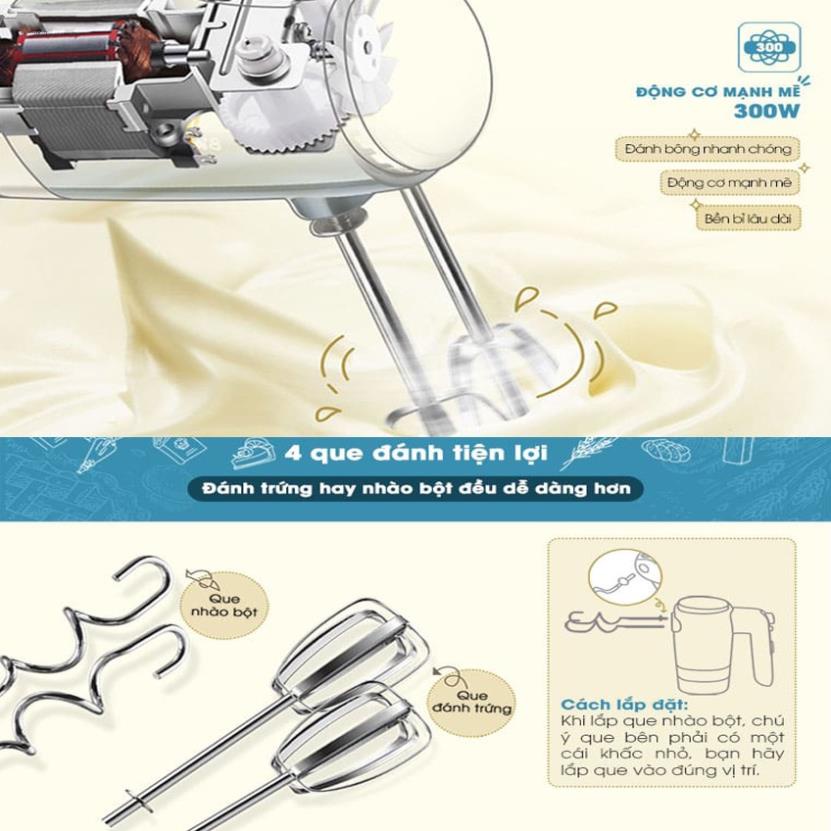 ✔ Bộ sản phẩm bao gồm: Máy đánh và 4 que đánh: 2 que nhào bột và 2 que đánh trứng, đế xếp que