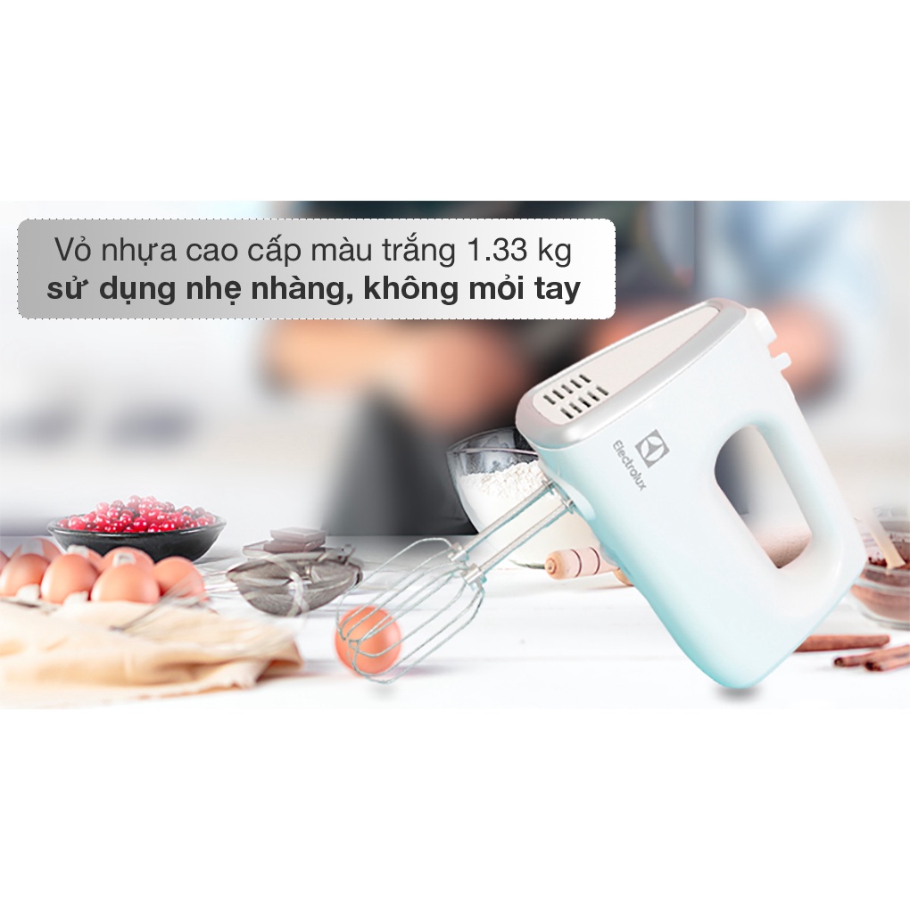 Máy đánh trứng Electrolux EHM3407 450 W vỏ nhựa cao cấp màu trắng viền bạc sang trọng, trọng lượng 1.33 kg sử dụng nhẹ nhàng, không mỏi tay