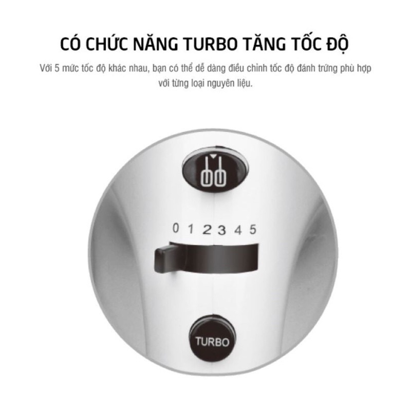 Sản phẩm có chức năng Turbo với 5 tốc độ đánh giúp bạn dễ dàng lựa chọn tốc độ sao cho phù hợp với từng loại nguyên liệu khác nhau. Kết hợp với các nút điều chỉnh được bố trí tiện lợi trên thân máy giúp bạn thao tác dễ dàng, nhanh chóng.