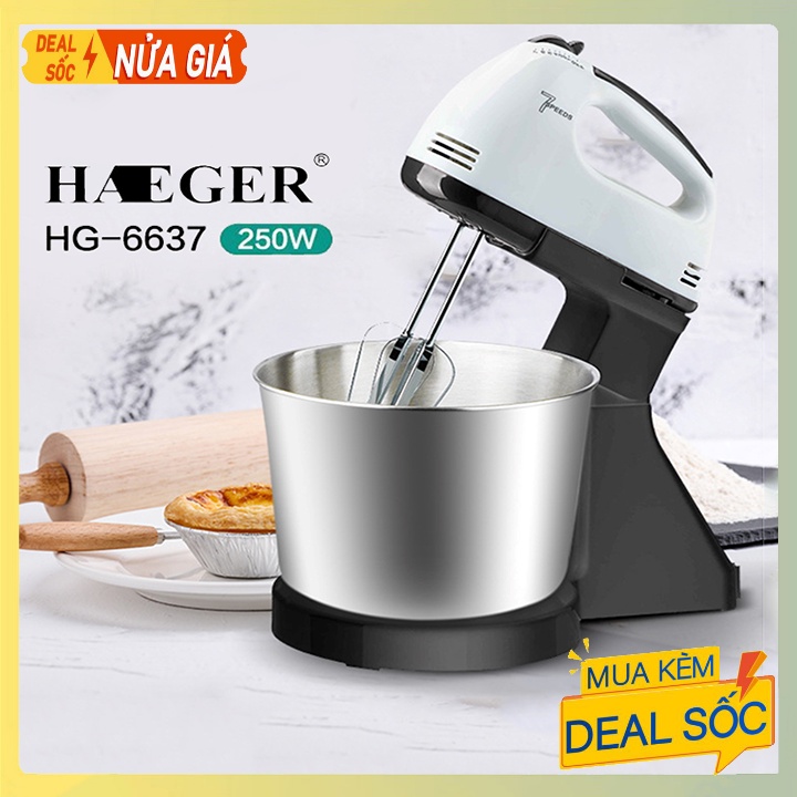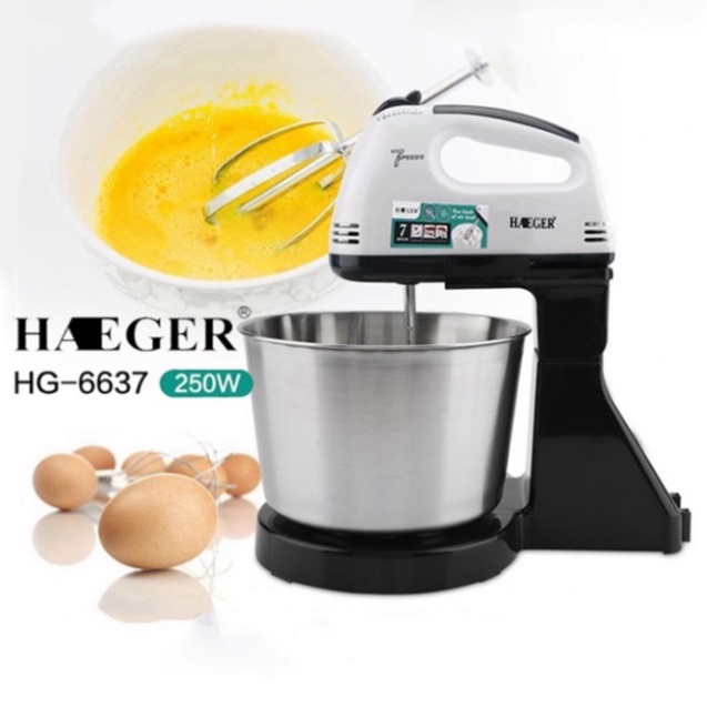 MÁY ĐÁNH TRỨNG VÀ TRỘN BỘT HAEGER HG-6637Máy đánh trứng, trộn bột là một trong những thiết bị không thể thiếu trong các cửa hàng làm làm bánh, từ bánh mì, bánh ngọt, bánh sinh nhật đến cả pizza.
