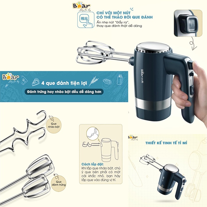 Máy đánh trứng trộn bột đánh kem cầm tay đa năng tiện dụng Bear B02L1 - HiMectMÁY ĐÁNH TRỨNG TRỘN BỘT CẦM TAY BEAR sở hữu thiết kế nhỏ gọn, tích hợp n tốc độ đánh khách nhau đáp ứng nhiều nhu cầu sử dụng. Thiết kế tháo rời tiện lợi, dễ dàng vệ sinh và cất trữ khi không sử dụng.