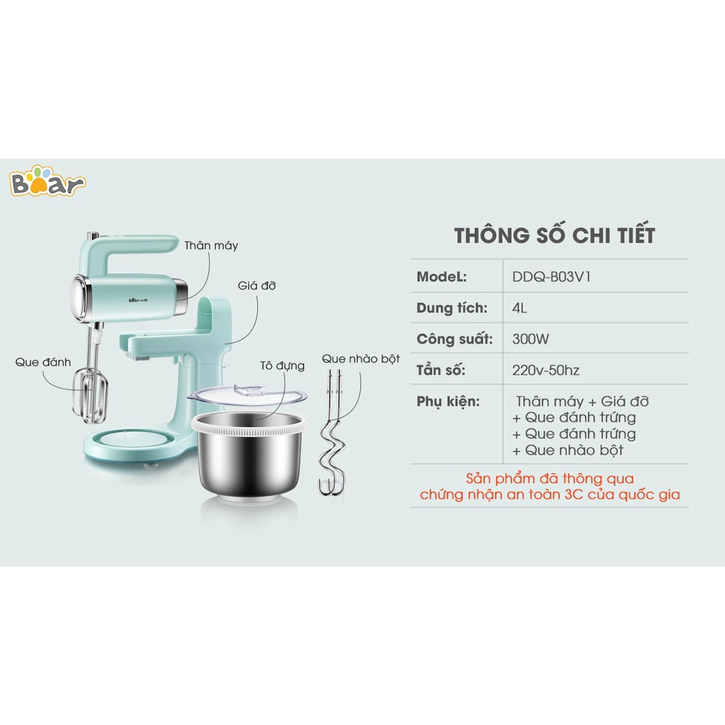 Giới thiệu Máy đánh trứng trộn bột để bàn đa năng Bear, đánh kem câm tay mini, 9 tốc độ gồm 4 que đánh, máy tháo rời, BH 18 th