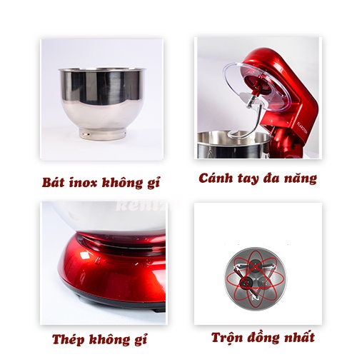 - Có 3 đầu trộn bằng thép không gỉ siêu bền dùng cho các chức năng đập, quết, nhào, trộn, đánh mịn…