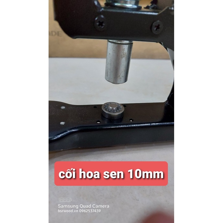 Size 10mm: Khoen hít lên bộ cối phía trên, chân khoen đóng xuống tự cắt bạt mỏng được nên không cần đục lỗ sẵn, bộ cối chẻ chân khoen chẻ bông, có thể lót long đền