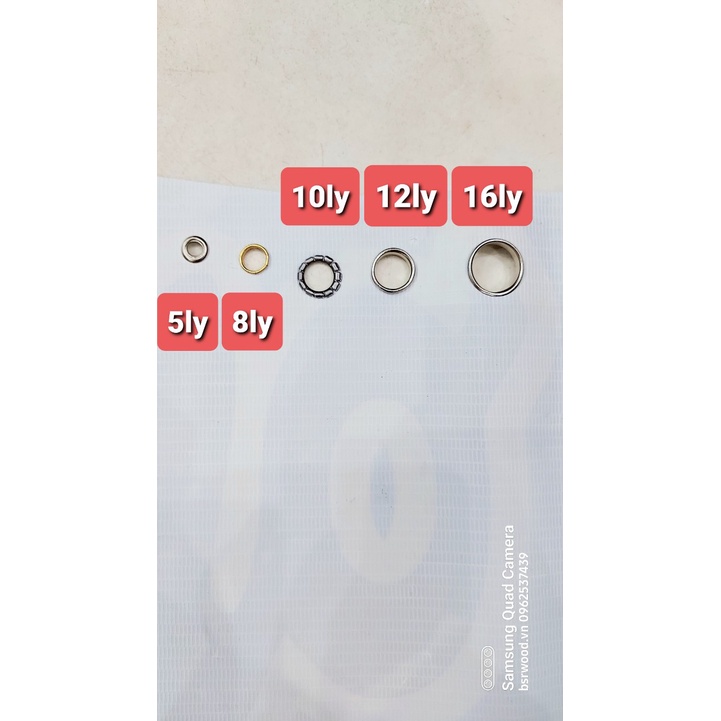 Size 8mm, 12mm, 16mm: Khoen hít lên bộ cối phía trên, chân khoen đóng xuống tự cắt bạt mỏng được nên không cần đục lỗ sẵn, bộ cối cuốn chân khoen, có thể lót long đền