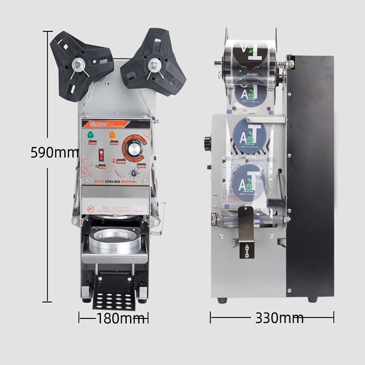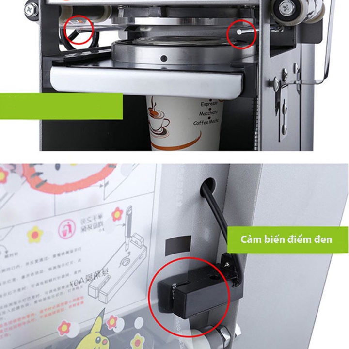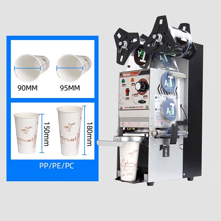 Máy được cải tiến với cơ chế vận hành bán tự động. Ngay sau khi cốc được bạn đẩy vào đúng vị trí dập khuôn, máy sẽ tự động cuộn màng và căn chỉnh lớp nilon phủ kín miệng cốc, sau đó tự động dập khuôn xuống, gắn chặt giấy nilon vào cốc đồ uống thơm ngon. Cuối cùng, bạn chỉ cần thêm thao tác kéo khuôn ra để lấy cốc là đã hoàn thành 100% công đoạn dập nắp.