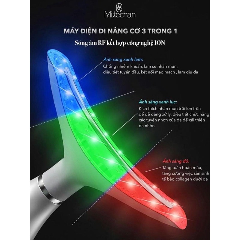 Máy điện di nâng cơ chống nhăn 3 in 1 MITECHAN kết hợp rung sóng âm tần số cao giúp se nhỏ lỗ chân lông, làm săn chắc da, tăng độ đàn hồi cho da, Tác dụng làm săn chắc da, nâng cơ mặt và chống lão hóa.