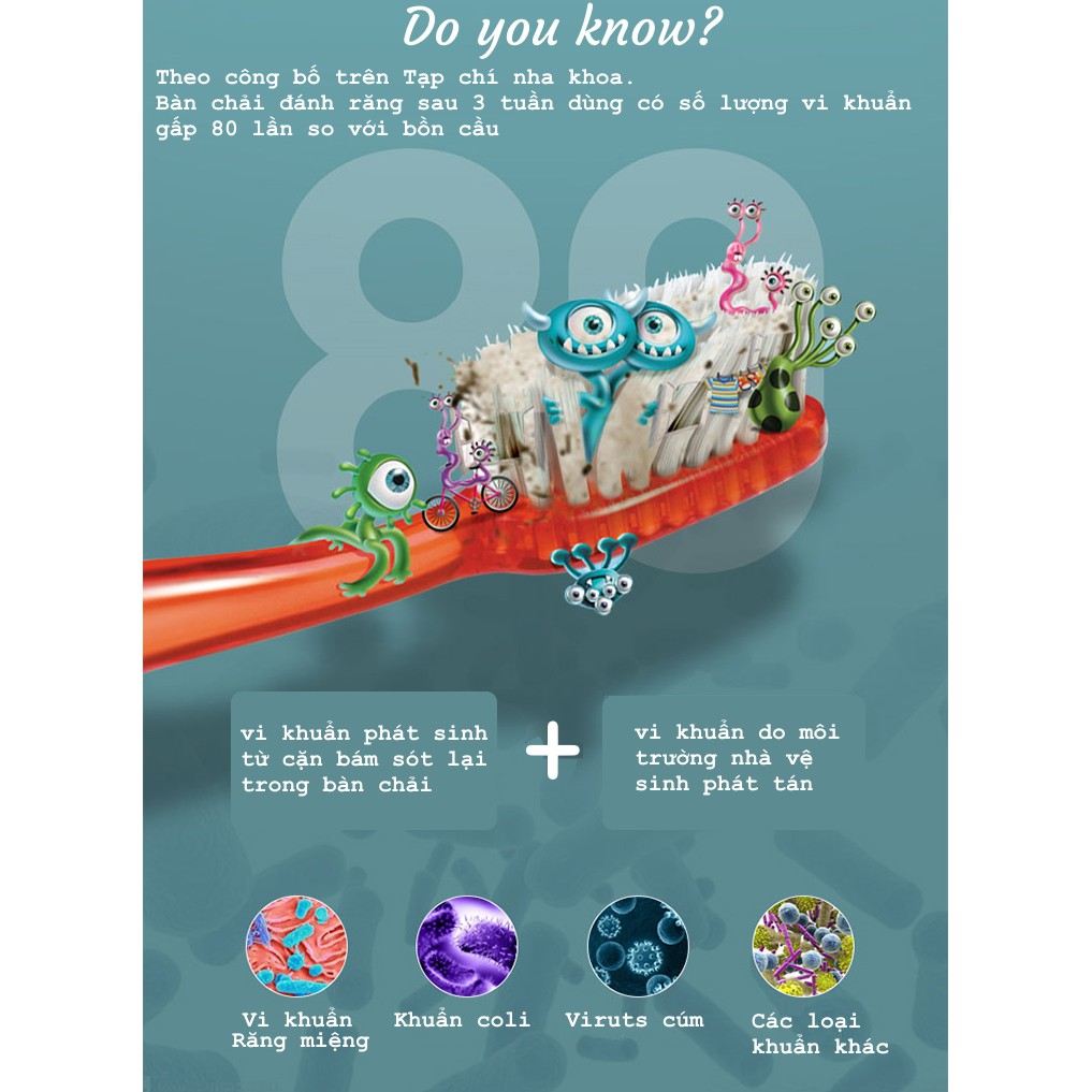 Theo công bố trên tạp trí nha khoa có nêu rằng sức khỏe răng miệng là yếu tố lớn đống góp tới chất lượng của sống của con người. Chăm sóc răng miệng đúng cách sẽ hạn chế tối đa nguồn lây nhiễm bệnh tật vào cơ thể. Cũng theo nghiên cứu này thì bàn chải đánh rang sau 3 tuần sử dụng có chỉ số vi khuẩn gấp 80 lần nơi mọi người vẫn nghĩ là mất vệ sinh nhất là bồn cầu. Điều này xuất phát từ nguyên nhân chính là môi trường nơi bàn chải đánh rang lưu trữ là môi trường có nguy cơ cao lây nhiễm vi khuẩn.Đứng trước chăn trở đó. Aone Mall đã nhập khẩu sản phẩm máy khử trùng cho bàn chải đánh răng thông minh để bảo vệ sức khỏe của mọi người trước nguy cơ nhiễm khuẩn từ bàn chải.