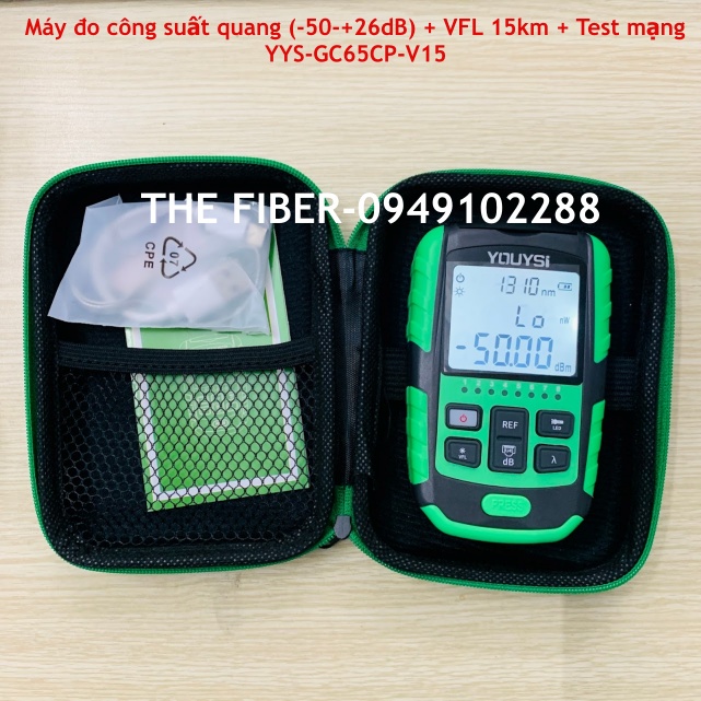 Máy đo công suất quang (-50-+26dB) + VFL 15km + Test mạng YYS-GC65CP-V15Chức năng chính:- Đo công suất quang: bước sóng hoạt động (nm) 850nm/980nm/1270nm/1300nm/1310nm/1490nm/1550nm/1577nm/ 1625nm/1650nm