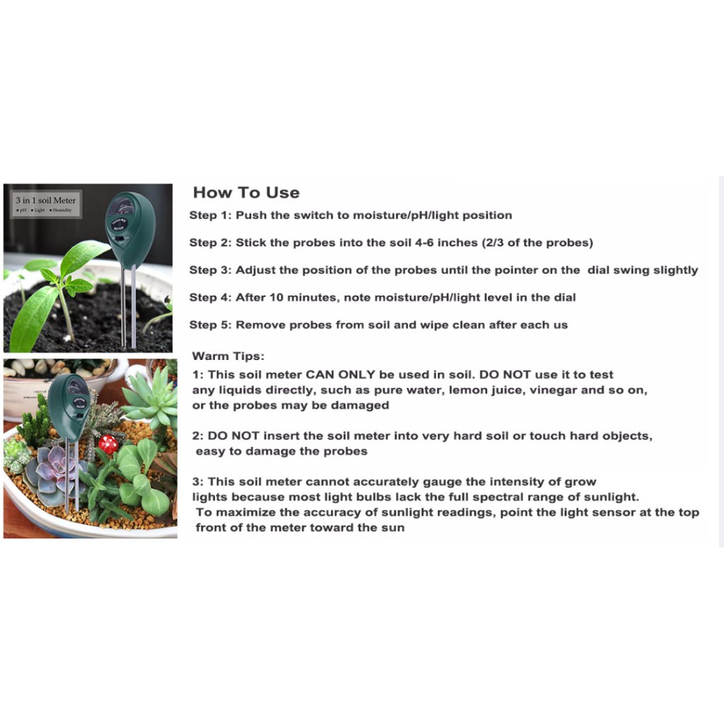 4. đo lường của độ ẩm và pH có thể được đọc chỉ nếu các đơn vị là trong đất, và xin vui lòng giữ các bộ test trong đất cho ít nhất 10 phút trước khi đọc cho hiệu suất tốt nhất