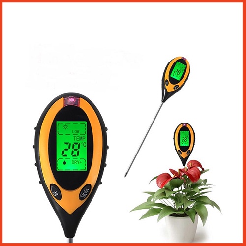 Máy đo độ PH đất 4 trong 1(PH, độ ẩm, ánh sáng, nhiệt độ) hay gọi là Dụng cụ đo PH 4 trong 1 đồng hồ hiển thị dạng điện tử, đo độ ẩm của đất, đo quang thông ánh sáng, đo nhiệt độ. (4 trong 1)Phần đo độ PH giá trị tương ứng là 3.5-9 trên đồng hồ hiển thị số, giá trị cơ bản của 7 là trung tính, nhỏ hơn số lượng lớn hơn các axit, theo cây trồng cần điều chỉnh độ pH của đất cho phù hợp.