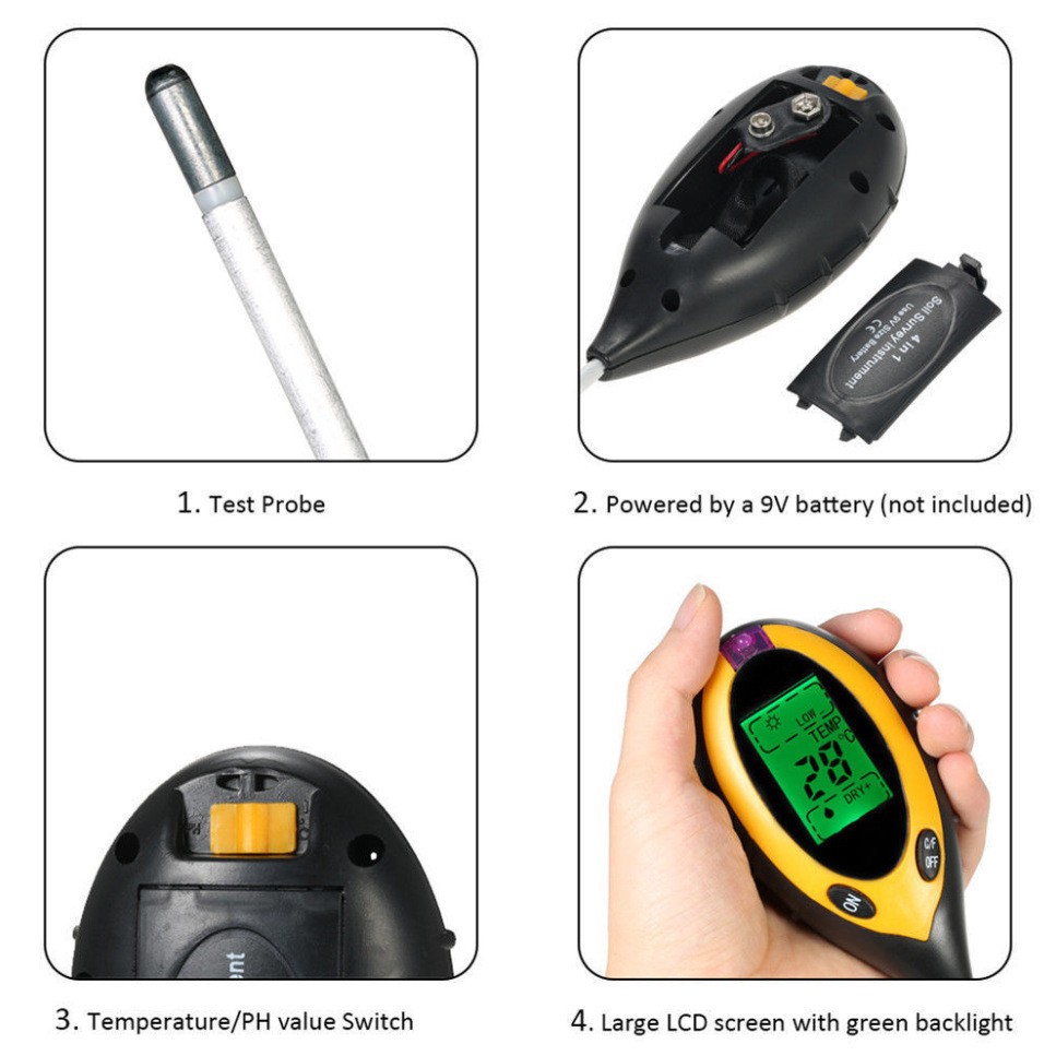 Giới thiệu Máy đo độ pH đất, độ ẩm, ánh sáng, nhiệt độ, dụng cụ đo pH 4 in 1