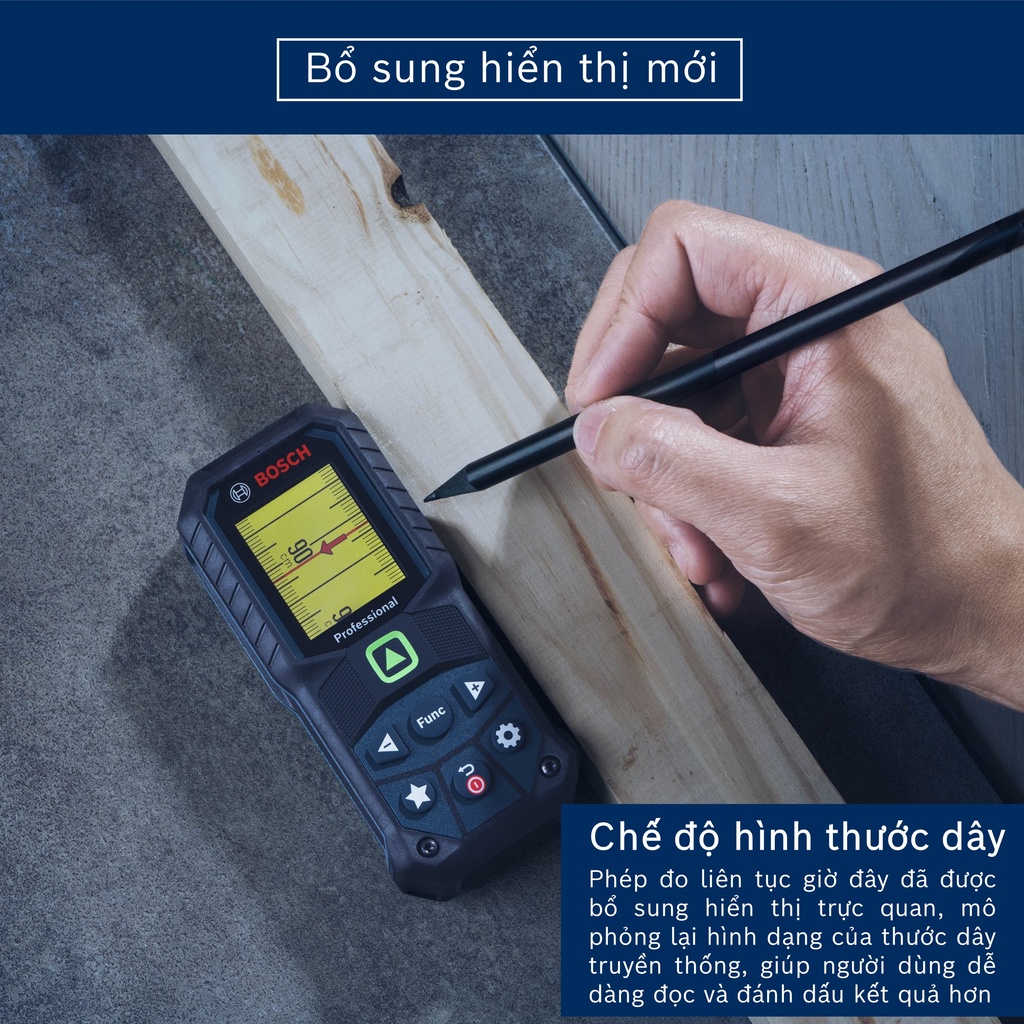 - Máy đo khoảng cách laser ĐẦU TIÊN của Bosch sở hữu điểm laser XANH, tăng độ hiện thị lên gấp 4 lần