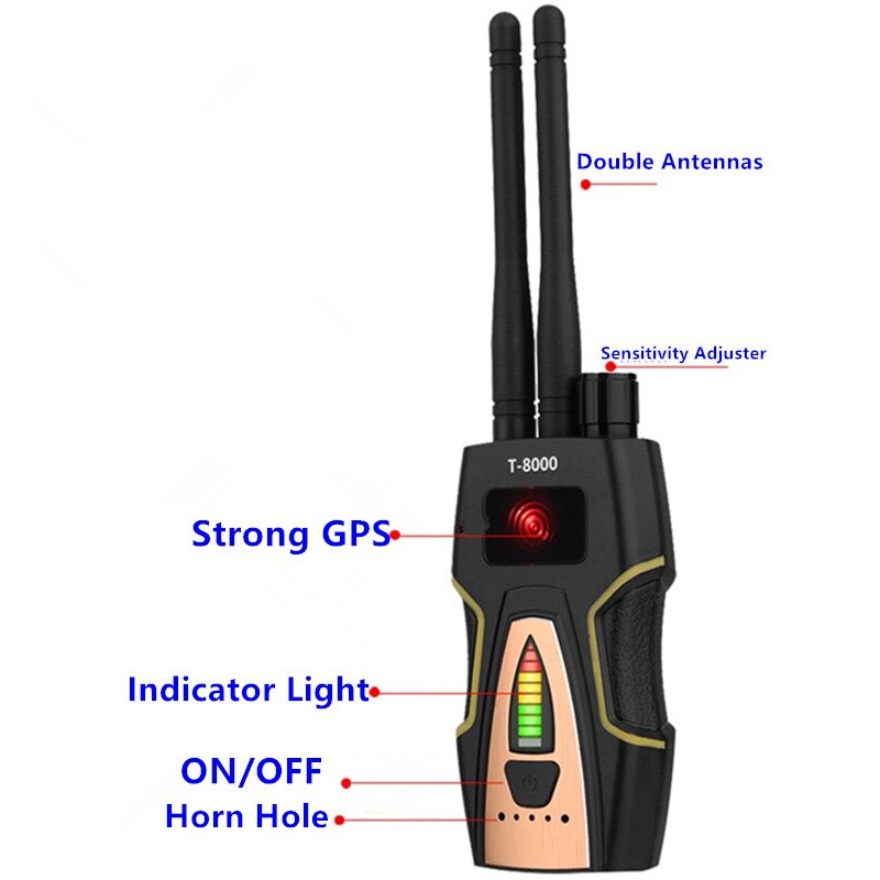MÁY DÒ PHÁT HIỆN CAMERA QUAY TRỘM, ĐỊNH VỊ GPS DETECTOR T8000 (VÀNG)MÁY DÒ ĐỊNH VỊ, CAMERA T8000 LÀ MỘT THIẾT BỊ PHÁT HIỆN SÓNG VÔ TUYẾN CHUYÊN NGHIỆP VỚI ĐỘ NHẠY BÉN CAO, TẦN SỐ PHÁT HIỆN LỚN VÀ ĐẢM BẢO ĐỘ CHÍNH XÁC. THIẾT BỊ CÓ ANTEN CẢM BIẾN TÌM KIẾM NÊN MANG ĐẾN HIỆU QUẢ CAO HƠN, SỬ DỤNG THIẾT BỊ ĐƠN GIẢN, KHÔNG TỐN KÉM NHIỀU THỜI GIAN.