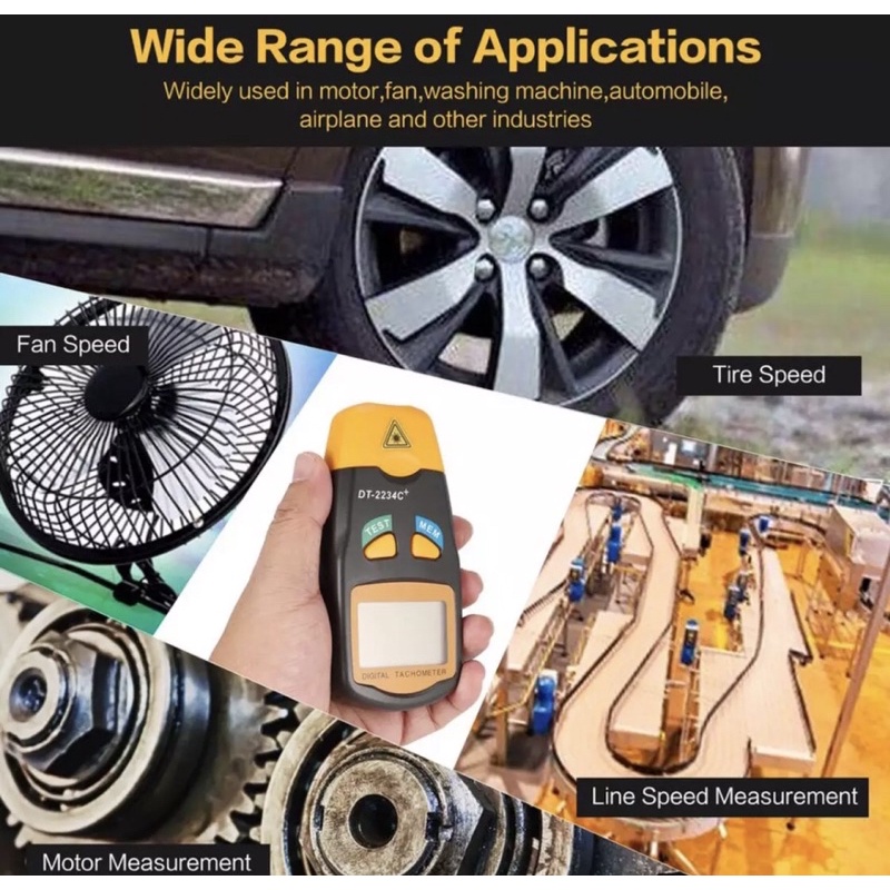 Máy đo tốc độ không tiếp xúc này là một máy đo tốc độ động cơ chuyên nghiệp và thiết thực để đo số vòng quay trên phút (RPM) với dải đo rộng và độ phân giải cao. Nó có tính năng đo độ chính xác cao, thời gian đo nhanh chóng và khoảng cách phát hiện dài lên đến 500mm (20 inch). Máy đo tốc độ này rất dễ sử dụng bằng cách dán một băng phản quang (bao gồm 3 chiếc trong gói) lên đối tượng mục tiêu, sau đó nhắm vào điểm đánh dấu. Máy đo tốc độ này có nhiều ứng dụng, chẳng hạn như đo tốc độ quay của máy, động cơ, bánh xe, máy tiện cho công việc cắt kim loại hoặc gỗ,