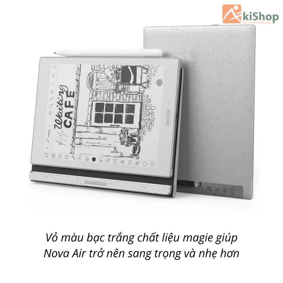 Máy đọc sách Boox Nova Air mỏng chỉ 6.3mm, nặng 235 gram sẽ khiến trải nghiệm đọc sách, ghi chú và vẽ đặc biệt hoàn hảo hơn bất cứ thiết bị nào. Chưa dừng lại ở đó, sự xuất hiện của bút ghi chú và vỏ case nam châm khiến Nova Air trở thành một sản phẩm thú vị và tiện lợi. Cuối cùng, thiết kế màu trắng trang nhã đi kèm vỏ hợp kim Magiê siêu nhẹ điểm suyết họa tiết vân đá giúp Nova Air sang trọng, nổi bật và khác biệt.