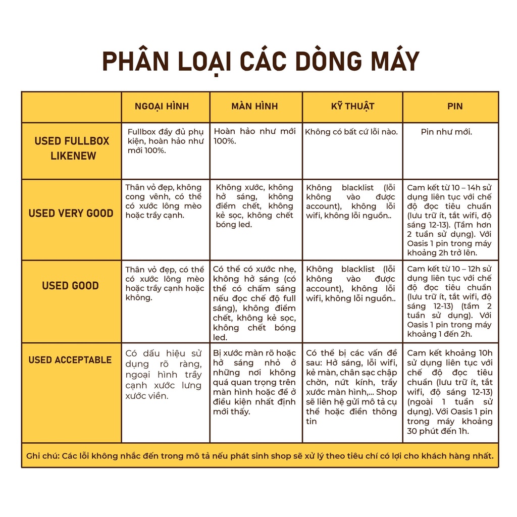 Màn hình: có thể có xước nhẹ, không hở sáng (có thể có chấm sáng nếu đọc chế độ full sáng), không điểm chết, không kẻ sọc, không chết bóng led.