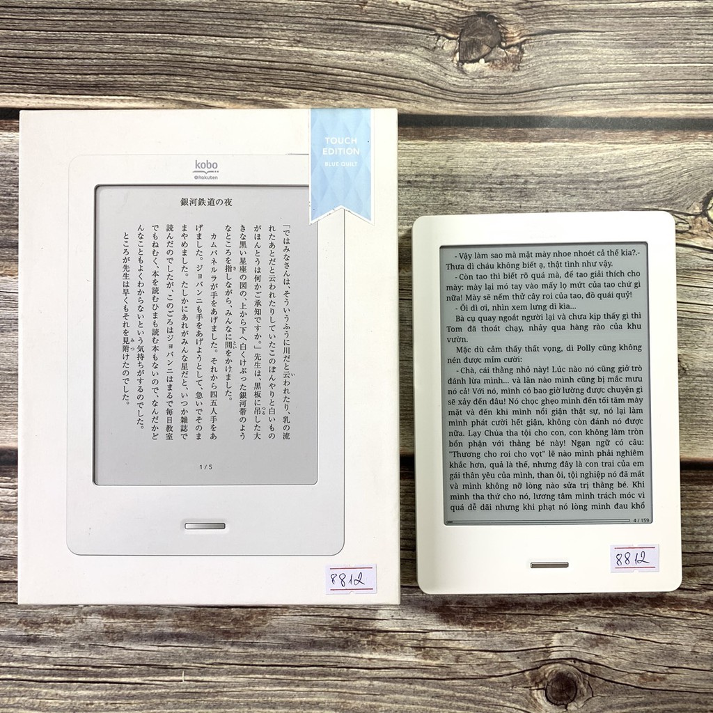 - Kobo Touch: 2Gb, hỗ trợ thẻ nhớ ngoài tối đa 32gb. Màn hình 6 inch.