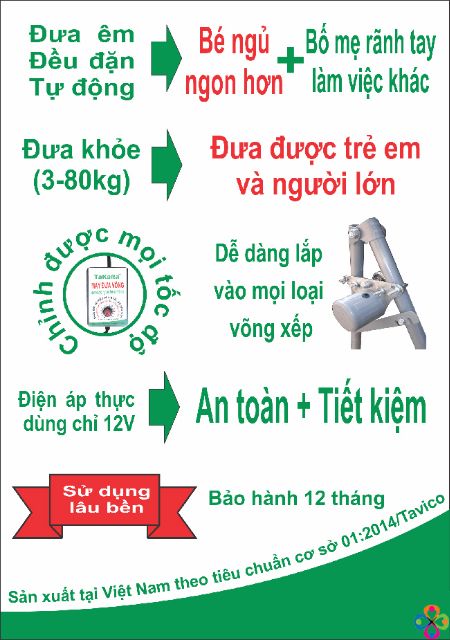 - Khi đó máy sẽ đưa tự động cho bé, bố mẹ không phải vất vả về thời gian mà bé lại ngủ ngon hơn và sâu hơn. Động cơ (motor) chạy bằng nhông nên đều và êm, sức đưa khoẻ, chịu trọng lượng lên đến 80kg, nên máy đưa được cho cả trẻ em và người lớn, không bị tình trạng đứt dây curoa.