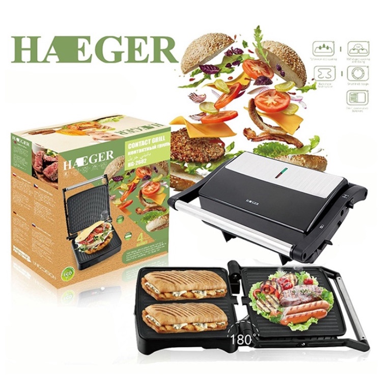 Máy kẹp ép nướng bánh Haeger, với thiết kế đẹp mắt, chất lượng hoàn hảo. Với dung lượng lớn có thể nướng phẳng 180 độ (hoặc gập lại thành 90 độ), dễ dàng làm món bánh sandwich, thịt nướng, thịt quay ...v...v....