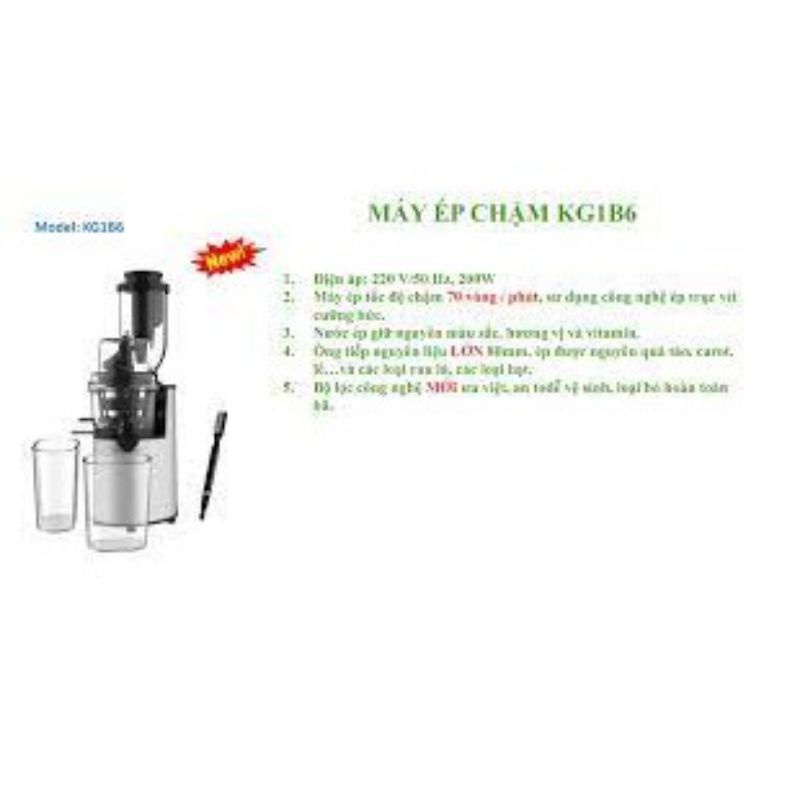 Máy ép chậm KG1B6 ép kiệt, khô bãMáy ép chậm ép hoa quả dưới lực ép của trục vít đặc biệt và động cơ giảm tốc, vận tốc chỉ khoảng 50 – 70 vòng quay/phút. Chính vì vậy, thành phẩm sau khi ép kiệt nước, kiểm tra bã rất khô và mịn. Lượng nước được ép ra được nhiều nhất.