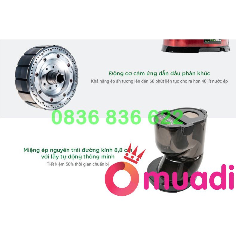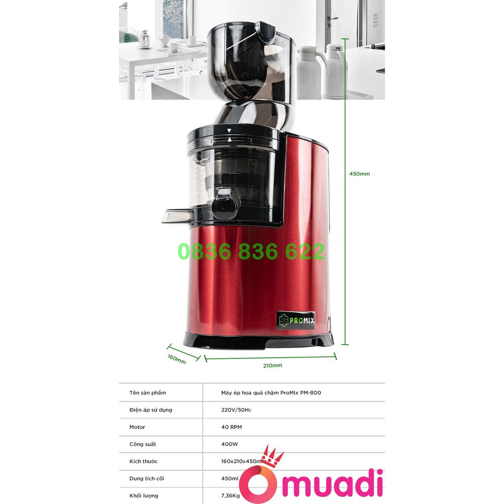Giới thiệu máy ép chậm Promix PM-800 ( Bảo Hành 3 năm )Máy xay ép trái cây này cực kỳ yên tĩnh trong quá trình vận hành, điểm mấu chốt chính là tốc độ quay của trục ép rất chậm chỉ ~ 50 RPM, ngoài ra còn nhờ thiết kế điều hợp giữa các bộ phận từ ống đầu vào tới bộ ép khoan và bộ lọc nước ép.