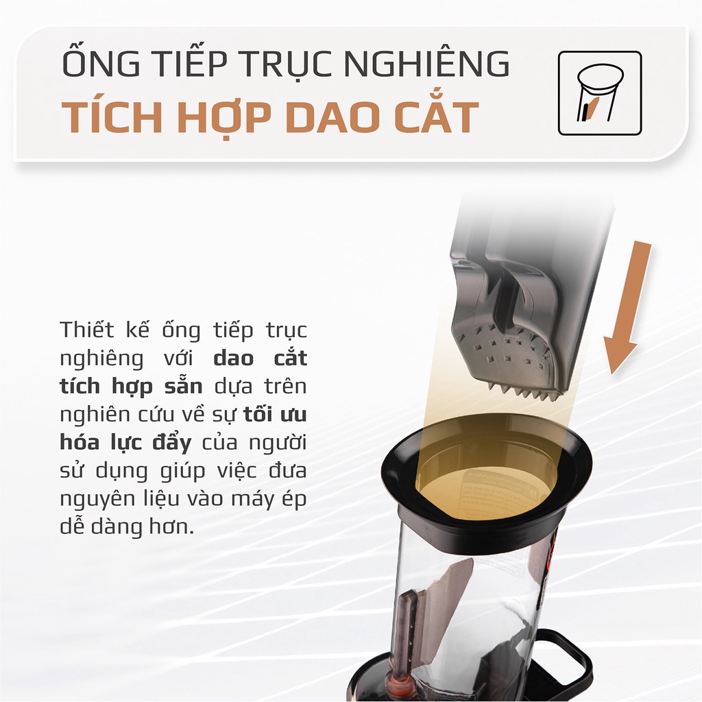 👉 Ép trái cây nguyên quả với ống tiếp nguyên liệu lớn, đường kính lên tới 80mm, giảm tối đa thời gian chuẩn bị.