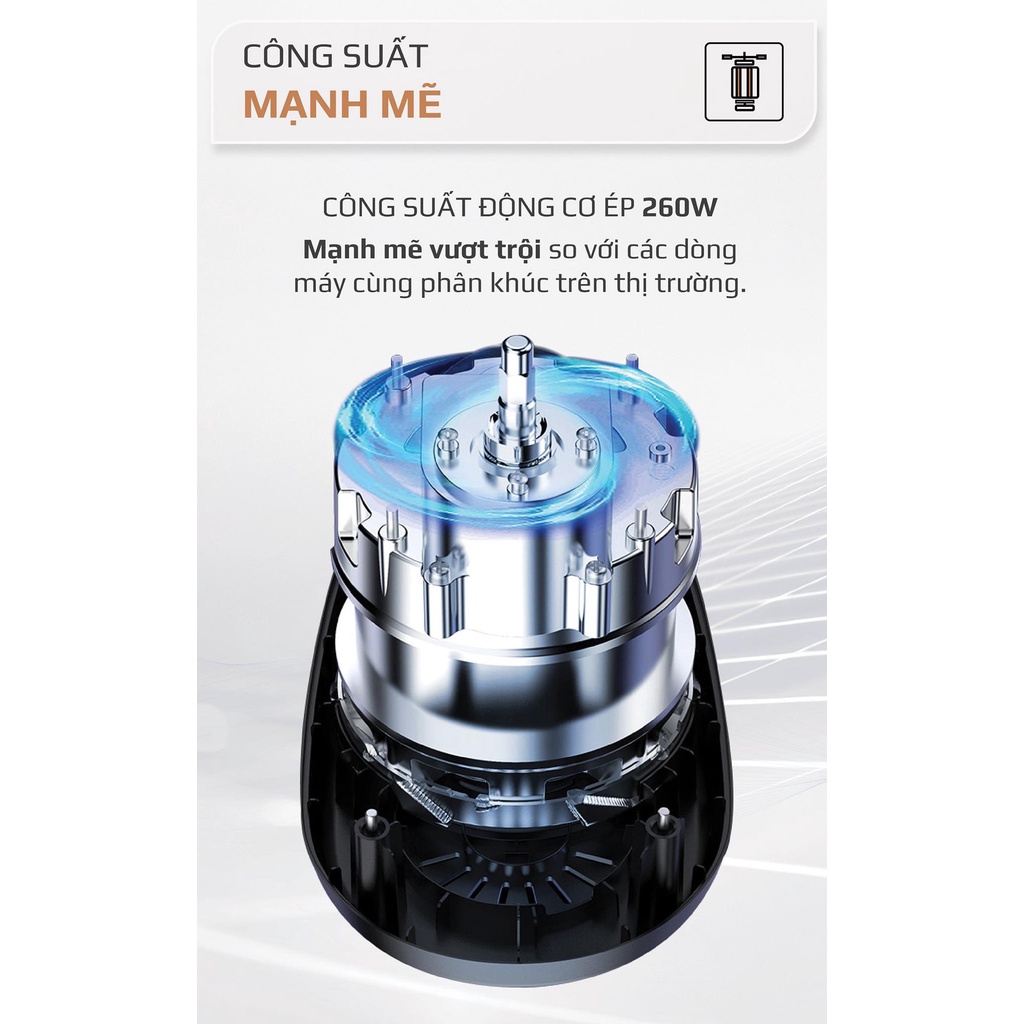 �Công nghệ ép chậm: Bằng cách ép nguyên liệu nhẹ nhàng, hương vị và các vitamin quý giá được giữ nguyên – Thích hợp với nhiều loại trái cây mềm, rau và thảo mộc.