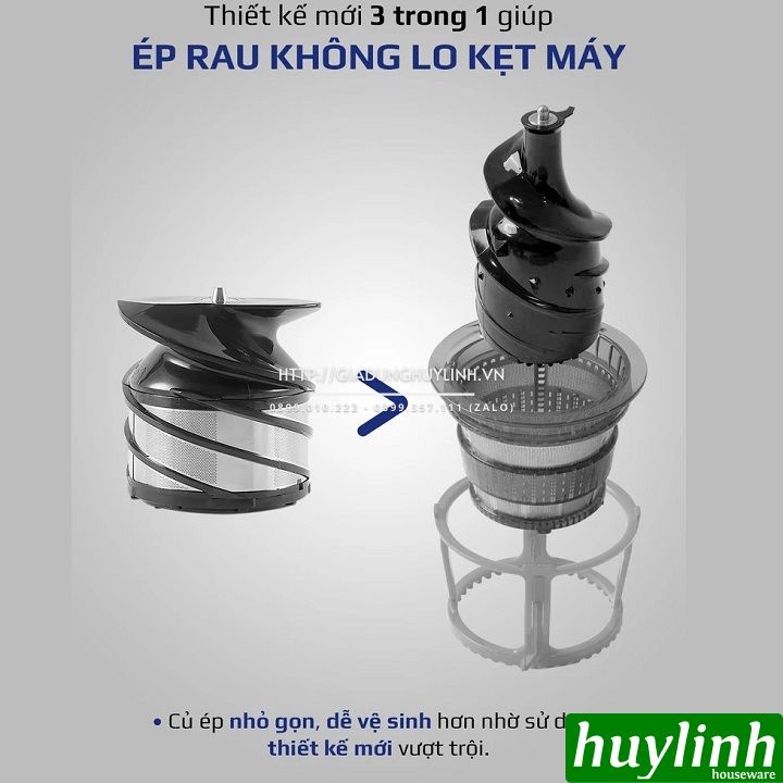 - Thiết kế mới lại củ ép, giúp ép rau và các trái cây nhiều chất xơ không còn bị kẹt máy