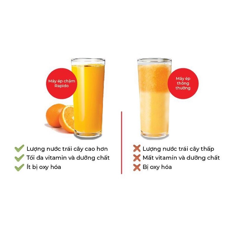 Với máy ép thông thường chỉ sau 15 phút nước ép đã bắt đầu tách nước, đổi màu do bị oxi hóa. Còn với máy ép chậm Rapido, vì được ép bằng công nghệ ép chậm tiên tiến của Đức nên luôn giữ được hương vị tươi ngon, đảm bảo giữ được tới 98% lượng dưỡng chất có sẵn trong hoa quả.