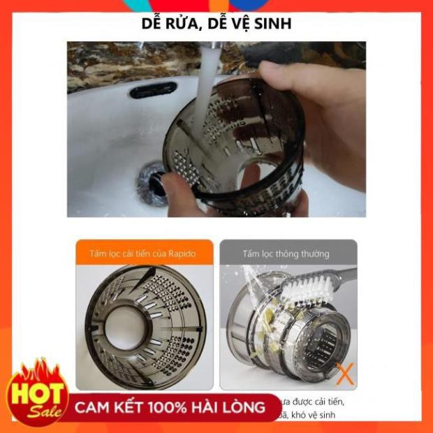 Lưới lọc bác cải tiến của Rapido giúp bã nguyên liệu không bị kẹt dính vào trong lưới lọc. Điều này không những giúp vệ sinh dễ dàng hơn mà còn giúp tách biệt bã và nước khi ép. Đem đến cho bạn ly nước ép hấp dẫn mà trẻ nhỏ cũng có thể sử dụng được.