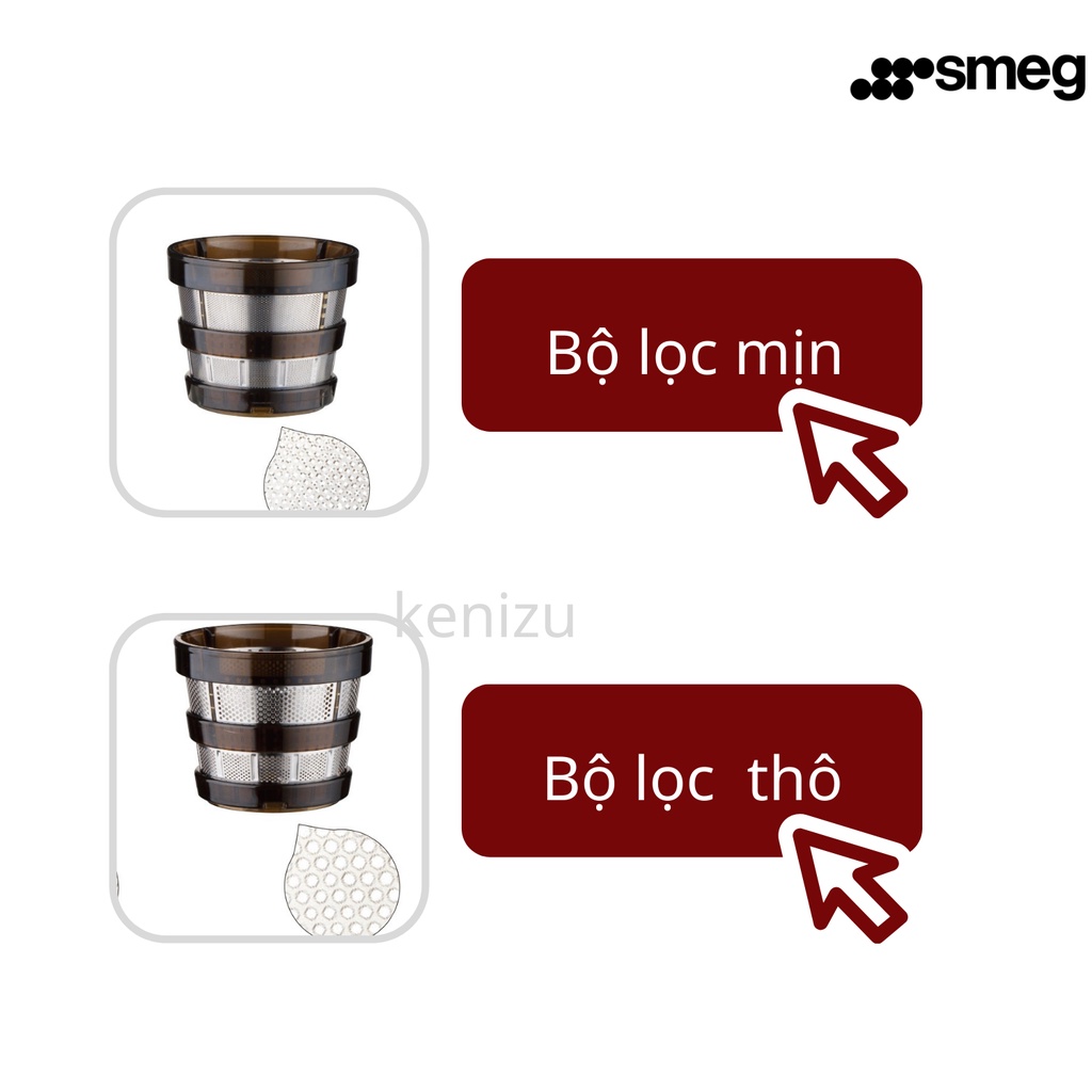 - Bộ lọc thô và bộ lọc mịn để tùy chọn: đi kèm với hai bộ lọc, một thô và mịn giúp bạn có thể lựa chọn phù hợp với nhu cầu sử dụng như muốn lấy nước ép đặc hơn, lỏng hơn hoặc ít bã.