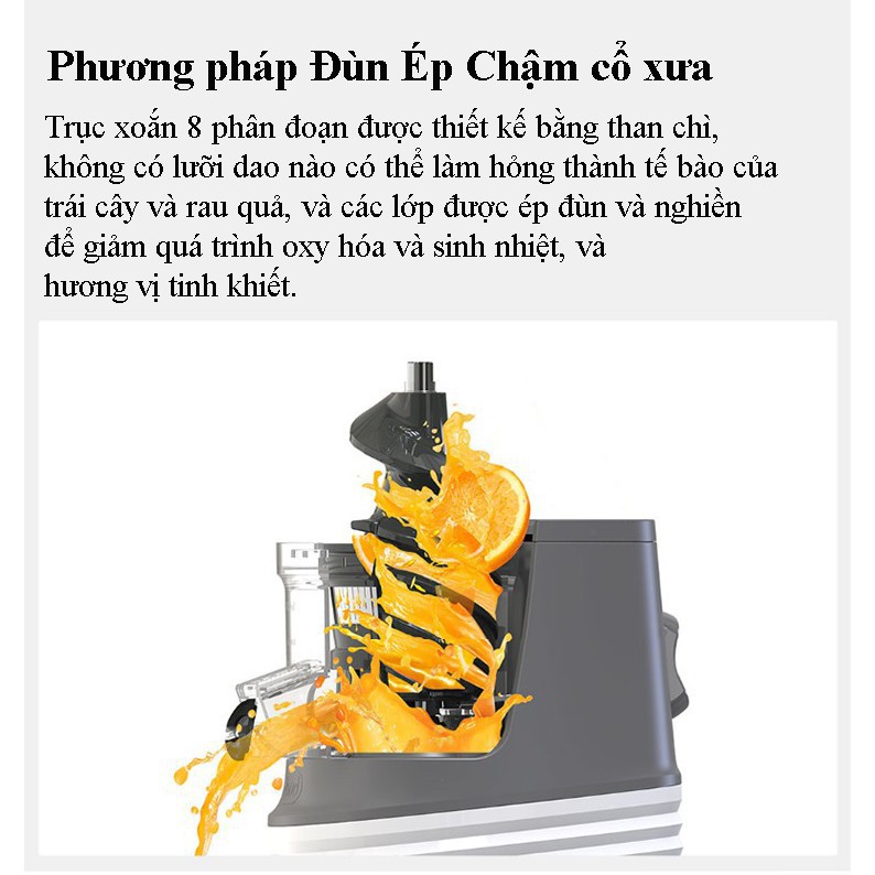 ✅Trục xoắn ốc 8 phân đoạn giúp phân chia trái cây thành từng mảnh đồng đều, tạo ra các ly nước ép nguyên bản không có cặn bã.