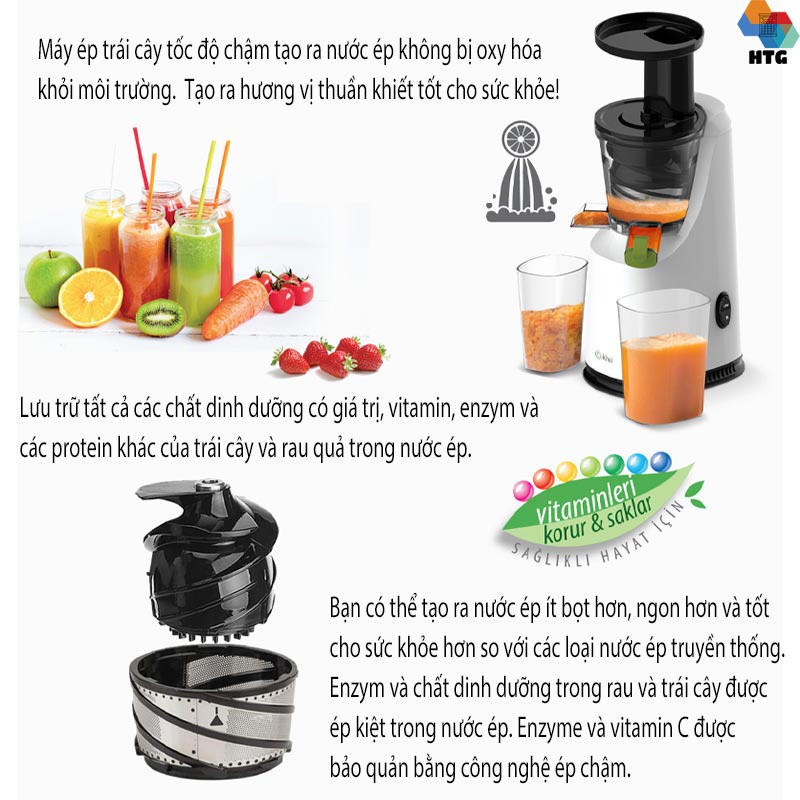 ✅Cơ chế ép chậm 40-70 vòng/ phút, cùn với động cơ xoay giúp oxy hóa thực phẩm thấp, và giữ lại nhiều chất dinh dưỡng.