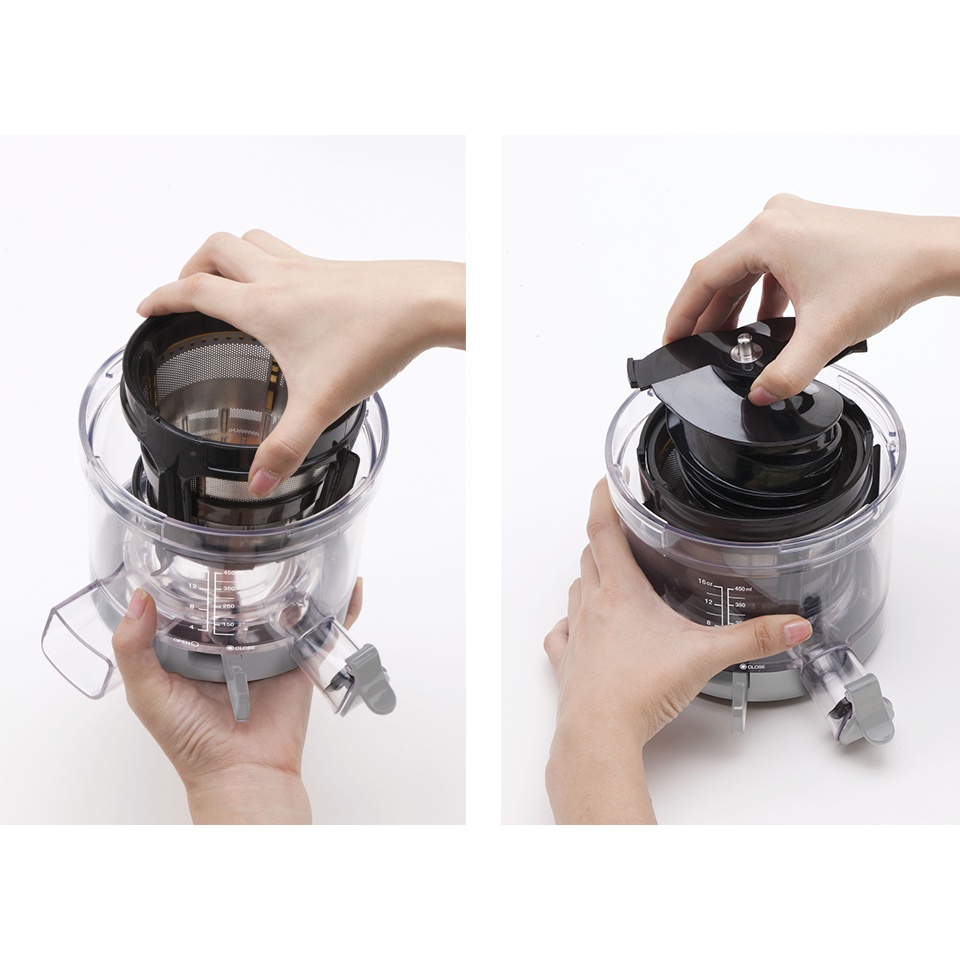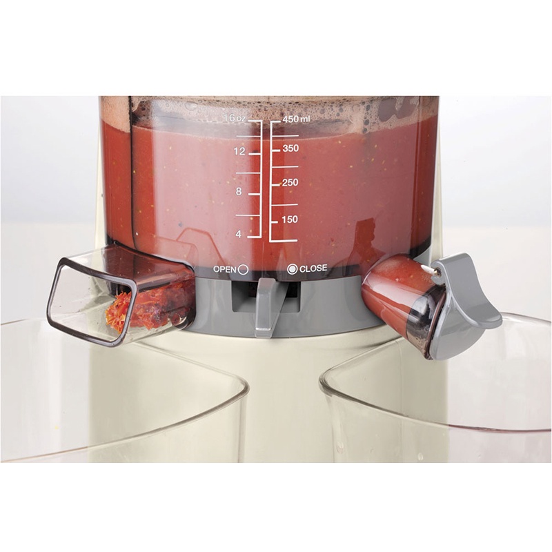 - Bằng cách này, bạn mở nắp hoàn toàn để lấy nước ép đặc cho sinh tố và đậy nắp lại cho nước ép lỏng không có bã. Trên vòi nước trái cây, bạn sẽ thấy vòi rót nước trái cây vào các ly khác nhau một cách gọn gàng và dễ dàng.