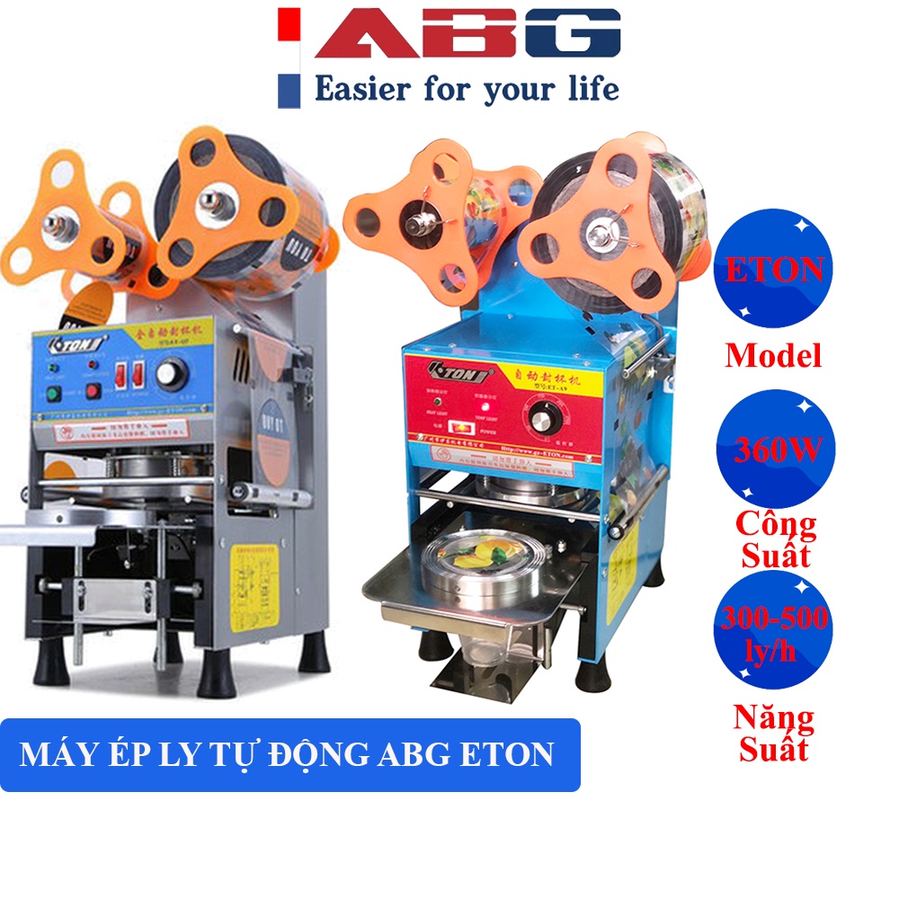 Máy Ép Miệng Ly Tự Động ABG ETON là dòng máy cỡ lớn có công suất cao, ổn định thích hợp dùng để dán miệng ly từ 300ml đến 700ml cho những quán nước giải khát, quán trà sữa, nước mía có lượng khách mua mang đi lớn, được sử dụng rộng rãi tại các quán thức ăn đồ uống thuộc loại máy công nghiệp nhẹ dùng trong đóng gói thức ăn đồ uống.Với những loại ly được dán miệng ly kín khi di chuyển đảm bảo an toàn (không rơi đỗ ra ngoài, giữ được độ nóng hoặc lạnh cho thức ăn lâu hơn) so với những loại ly trước đây dùng nắp rời đóng bằng tay sản phẩm dễ rơi, đổ tháo...