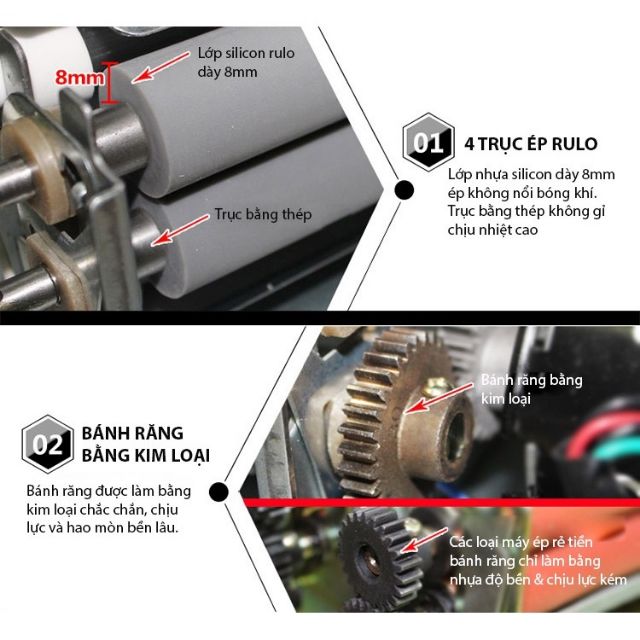 - Tính năng ép nóng , ép nguội- Sử dụng 4 Rulo nhiệt và nguội