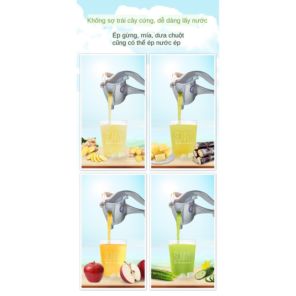 Dụng cụ ép trái cây được làm từ hợp kim nhôm chất lượng cao mang lại tuổi thọ cao, chống rỉ sét. Dụng cụ ép chất lượng cao cấp đảm bảo rằng tay cầm không bị cong khi ép trái cây có múi lớn. Máy có thể ép được tất cả các loại hoa quả từ cứng đến mềm như: mía, ổi, dứa, lê, cam, chanh,...Sản phẩm rất thuận tiện để sử dụng và với một thao tác vắt dễ dàng, bạn có thể vắt từng chút nước khỏi trái cây. Máy ép trái cây bằng tay không tốn điện, giữ nguyên được chất dinh dưỡng của hoa quả. Máy ép trái cây này có thể tháo rời để làm sạch dễ dàng.
